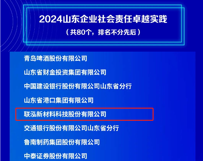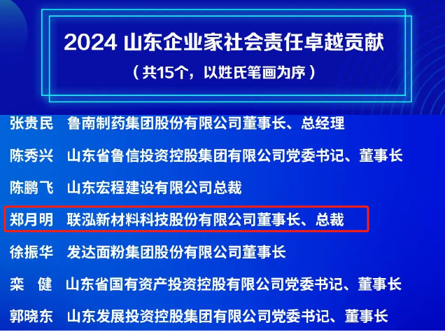 2024年12月27日,“2024山東企業(yè)(企業(yè)家)社會(huì)責(zé)任”展示活動(dòng)結(jié)果揭曉,聯(lián)泓新材料董事長(zhǎng)鄭月明榮獲“2024山東企業(yè)家社會(huì)責(zé)任卓越貢獻(xiàn)”。聯(lián)泓新材料入選“2024山東企業(yè)社會(huì)責(zé)任卓越實(shí)踐”。